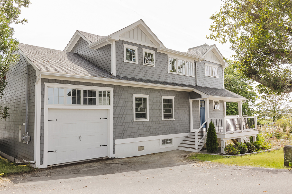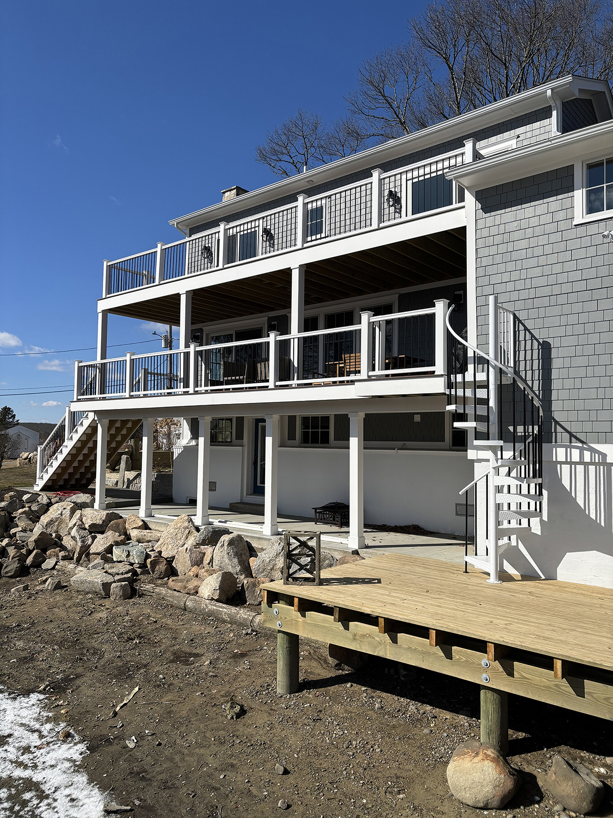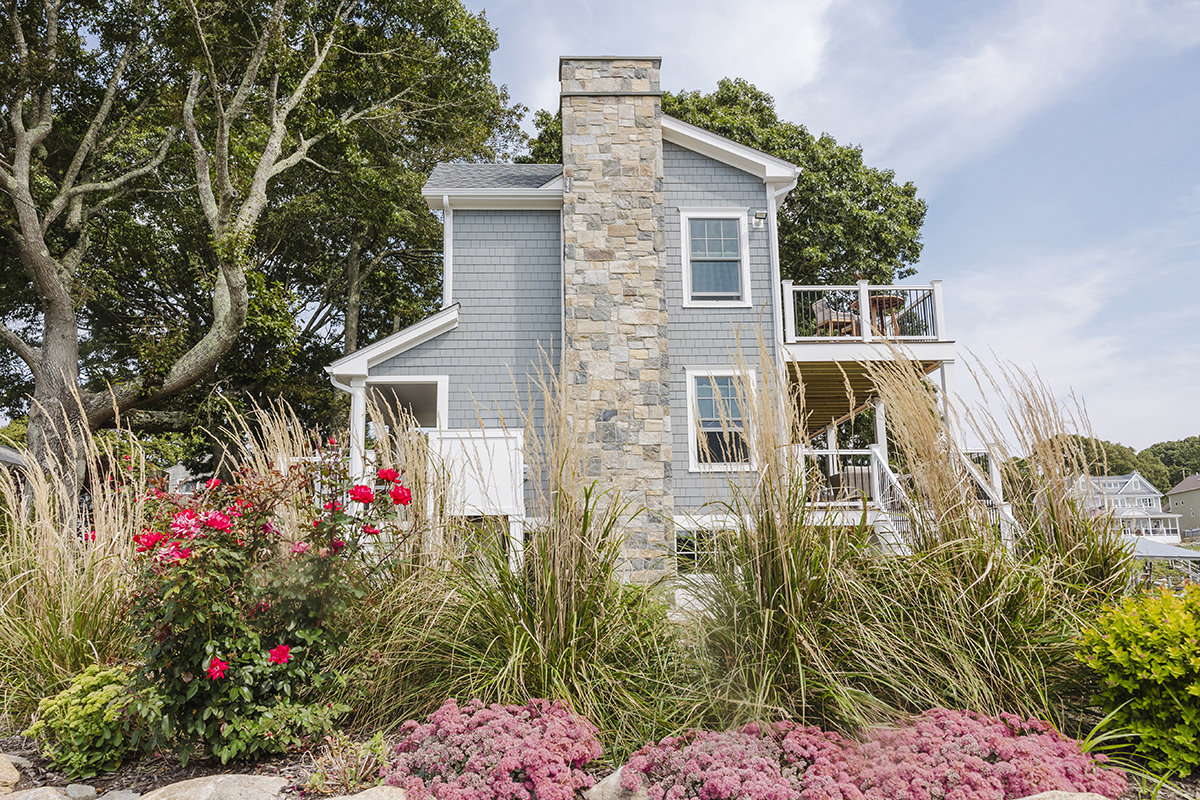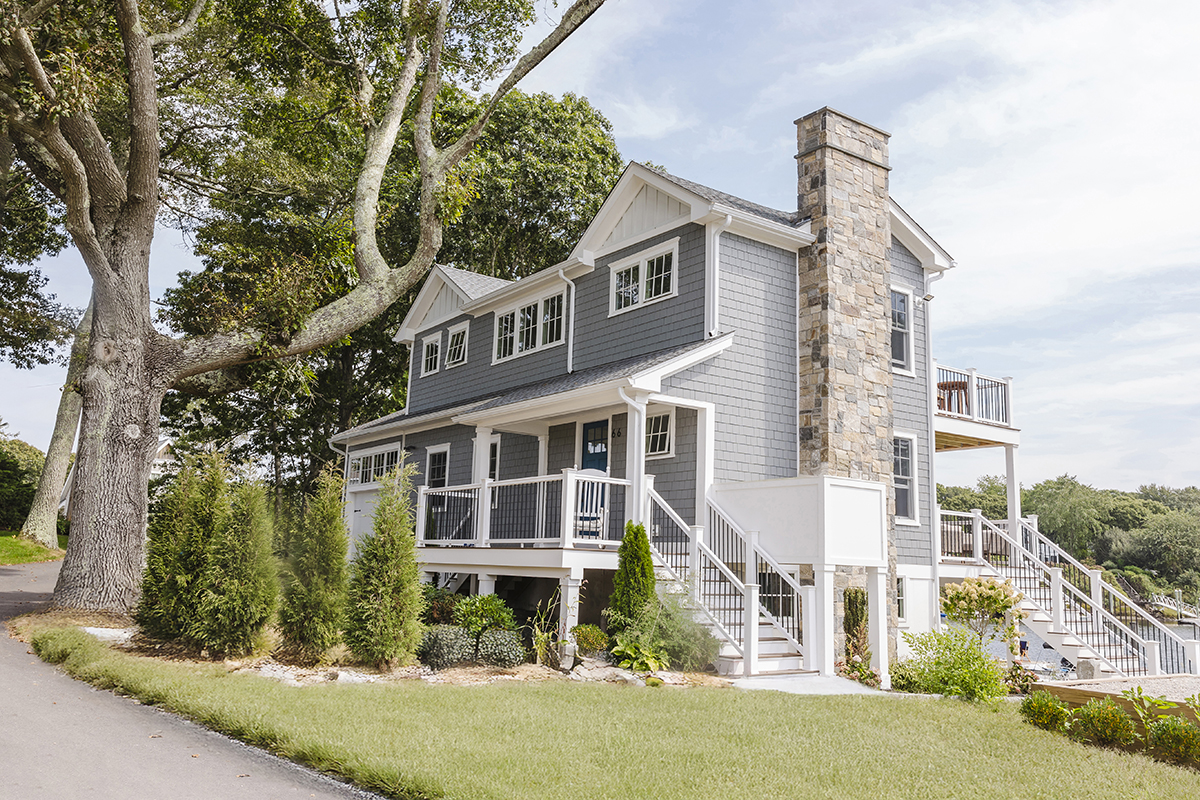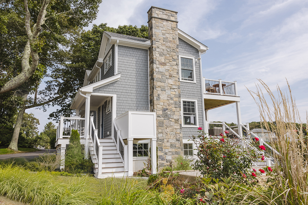Original home teardown and complete rebuild. Required CRMC coastal permitting. Installed Helical Piers to support multi-story decks extending over the ocean bay. Thin stone veneer masonry chimney and complete landscaping.