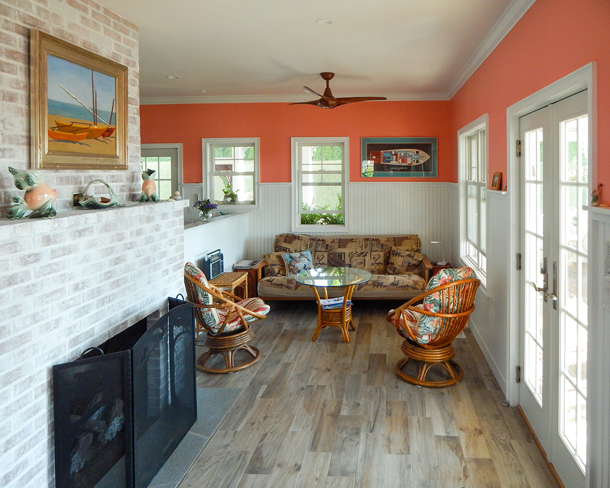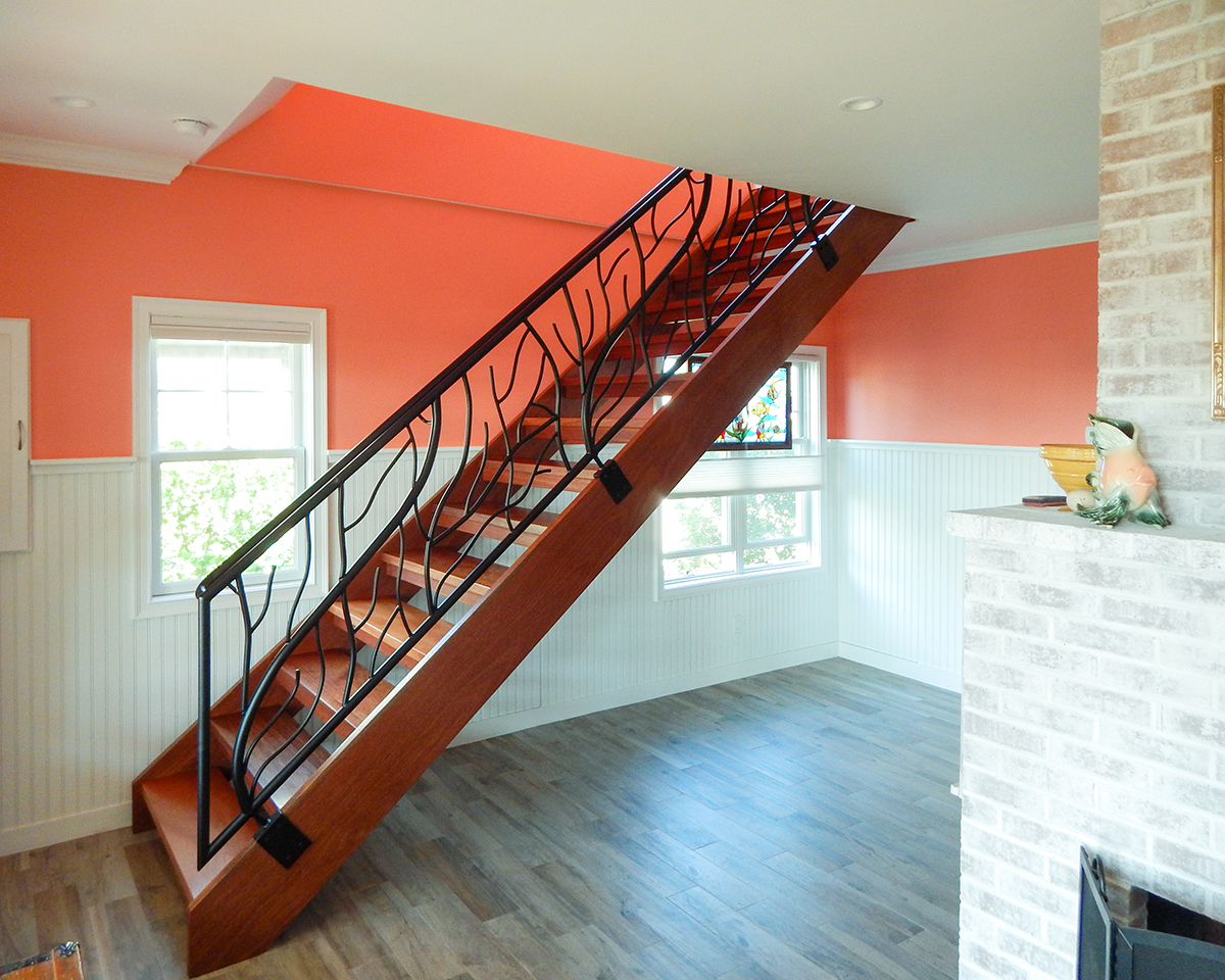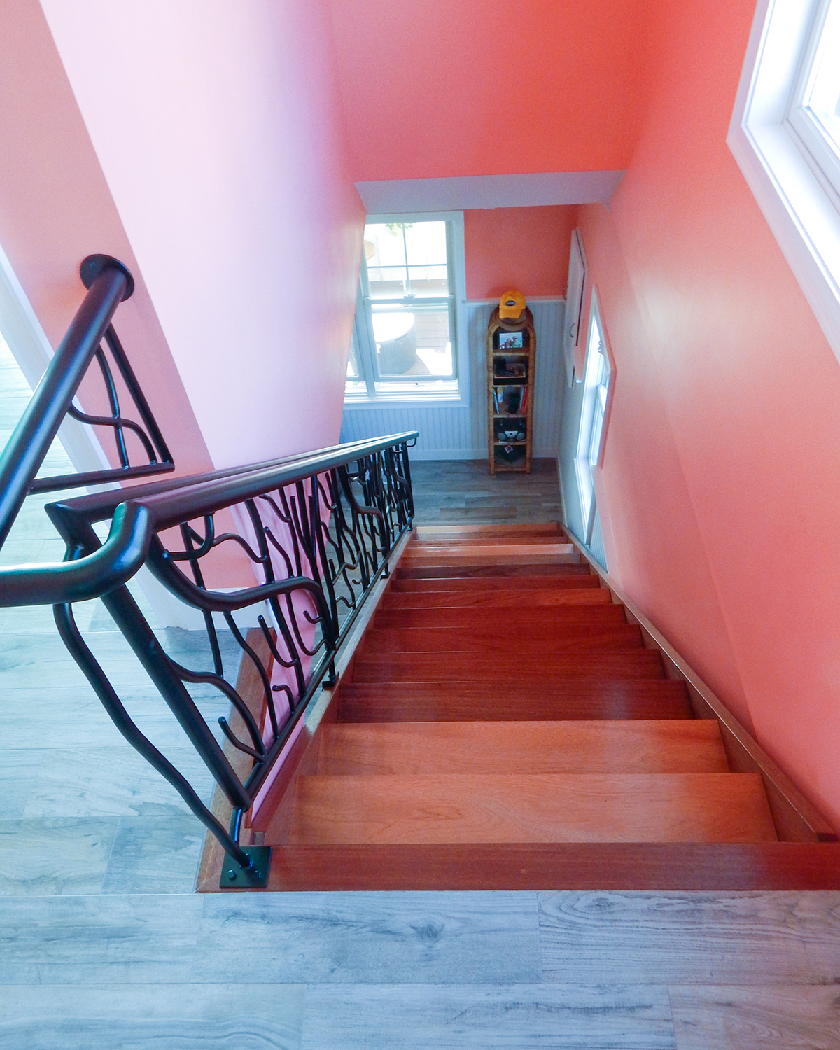 Complete interior and exterior remodel, reframed & improved support of first floor joist and deck within crawl space, added a complete second floor addition, and built and installed custom mahogany open staircase.